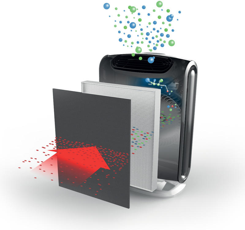 * filtr True HEPA wyłapuje 99,97% cząstek i zanieczyszczeń wielkości zaledwie 0,3 mikrona, w tym zarodniki pleśni, drobnoustroje, wirusy, pyłki, opary chemiczne (LZO), roztocza oraz większość mikrobów i alergenów
