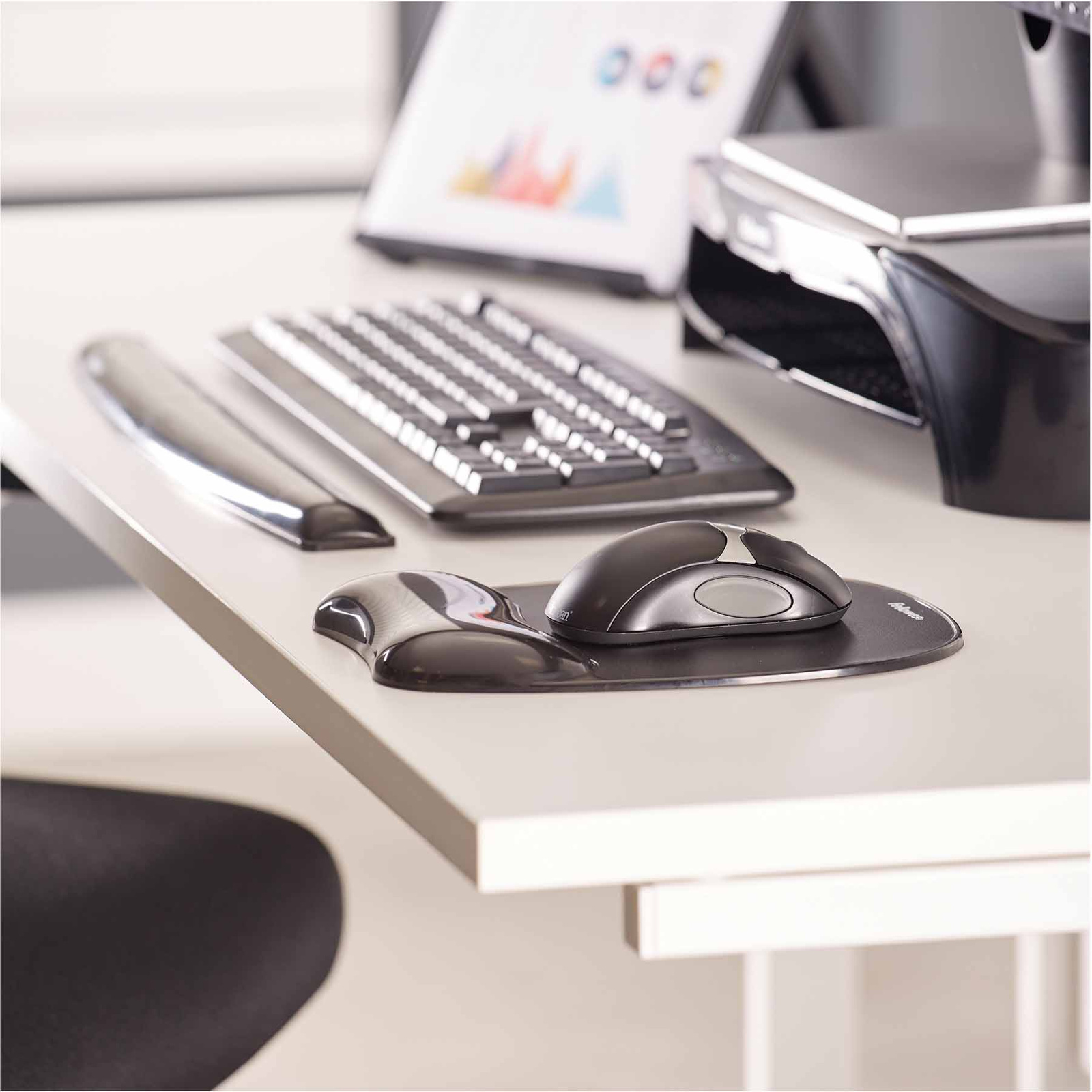 * Podkładka żelowa przed klawiaturę pomaga utrzymać nadgarstek w prawidłowej pozycji w trakcie pisania na klawiaturze