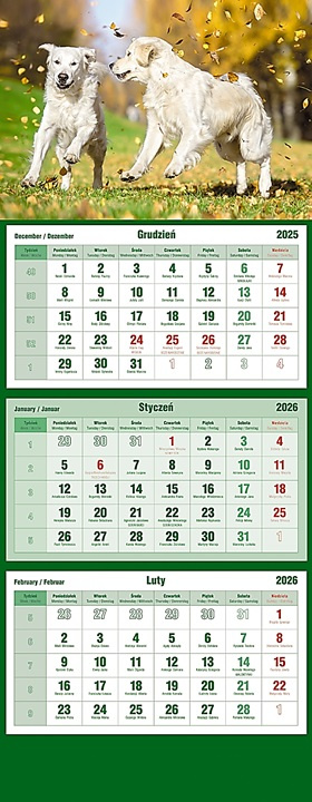 * kalendarz trójdzielny T-105T * układ kalendarium: 1 kartka - 1 miesiąc * druk pełnokolorowy * główka pełnokolorowa * okienko przesuwane * nazwy miesięcy i tygodni w wersjach językowych * rodzaj papieru: offset - PAPIER OFFSETOWY to niepowlekany, bezdrzewny papier o matowej, lekko chropowatej powierzchni i dobrej absorpcji tuszu, stosowany do druku książek, broszur i materiałów biurowych - jest to ekonomiczna opcja, idealna do materiałów tekstowych, dokumentów oraz druków jedno- i wielokolorowych, gdzie ważna jest możliwość pisania po nim długopisem czy piórem * gramatura papieru: 80 g/m² * kolor papieru: biały * wymiary kalendarza: 315 x 855 mm * ilość stron: 12 * miejsce na nadruk reklamowy * ilustracje: Sokolica (symbol: X13022, T-105T-01), plarza (symbol: X13023, T-105T-02), góry (symbol: X13025, T-105T-03), las (symbol: X13026, T-105T-04), jesień (symbol: X13027, T-105T-05), górski widok (symbol: X13029, T-105T-06), zatoka (symbol: X13030, T-105T-07), pałac (symbol: X13031, T-105T-08), psy (symbol: X13032, T-105T-09), koty (symbol: X13033, T-105T-10), konie (symbol: X13034, T-105T-11) * jednostka sprzedaży 1 sztuka * firma MICHALCZYK I PROKOP powstała w 1992 roku, w Łodzi - w 1994 roku asortyment wzbogacił się o pierwsze tytuły z grupy "Druki Akcydensowe", a wkrótce marka Michalczyk i Prokop osiągnęła znaczący udział na rynku akcydensów adresowanych do przedsiębiorców - od 2001 roku marka firmuje przydatne w biznesie przedmioty osobistego użytku - kolekcje aktówek i teczek wykonanych z materiałów skóropodobnych - w 2006 roku firma wprowadziła na rynek markę Tetis, która reprezentuje artykuły piśmiennicze, biurowe i szkolne - w asortymencie można znaleźć również kalendarze, terminarze, wysokiej klasy papiery o wysokich gramaturach, z różnymi tłoczeniami