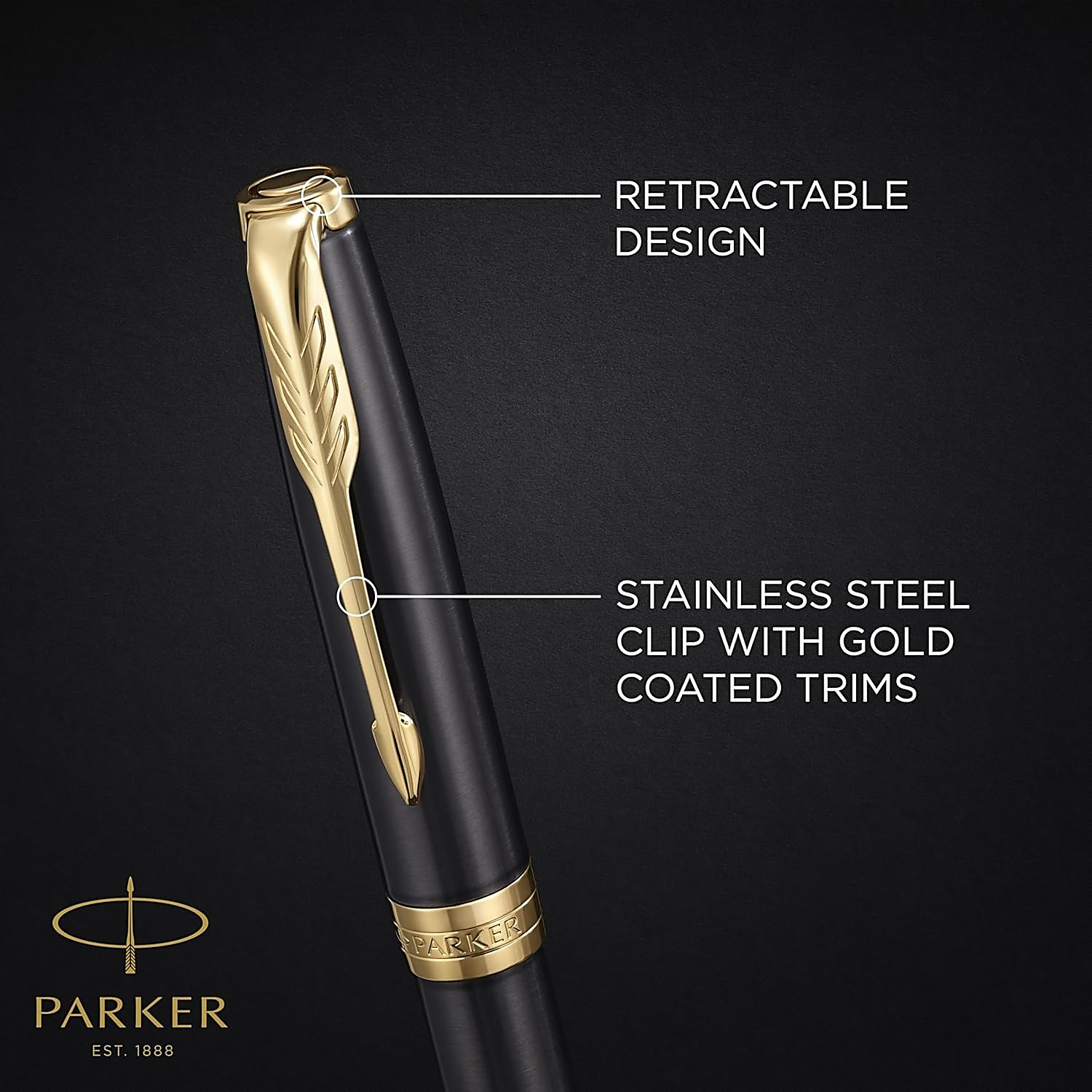 * misterne detale i złota powłoka wykonana techniką PVD na klipsie oraz mosiężne wykończenia idealnie komponują się z nasadką i korpusem ze stali szlachetnej, pięknie wykończonym lakierem w klasycznym odcieniu szarości
