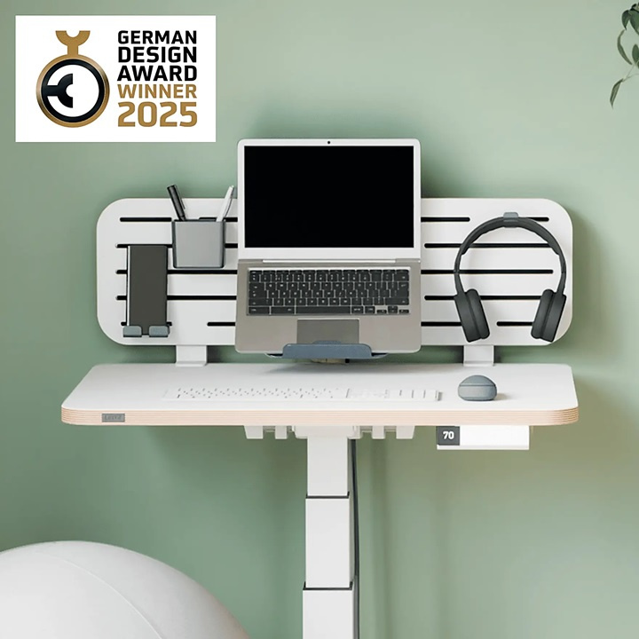 * unikalny uchwyt na laptopa (o przekątnej ekranu do 15" i maksymalnej głębokości 245 mm), z łatwością mocowany do organizera, umożliwia ustawienie ekranu laptopa na idealnej pod względem ergonomii wysokości, korzystając z jednego z 2 ustawień (194 mm lub 235 mm), zwiększa komfort oraz pomaga zapobiegać bólom szyi i pleców podczas pracy w pozycji siedzącej lub stojącej, co ma pozytywny wpływ na nasze samopoczucie